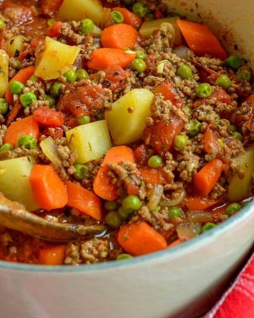 Ce ragoût copieux et savoureux associe du bœuf haché à un mélange de légumes classiques, le tout mijoté dans un bouillon de tomates et de bœuf parfumé aux herbes aromatiques.